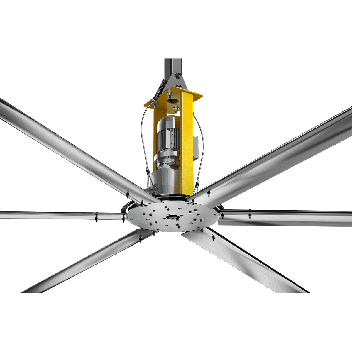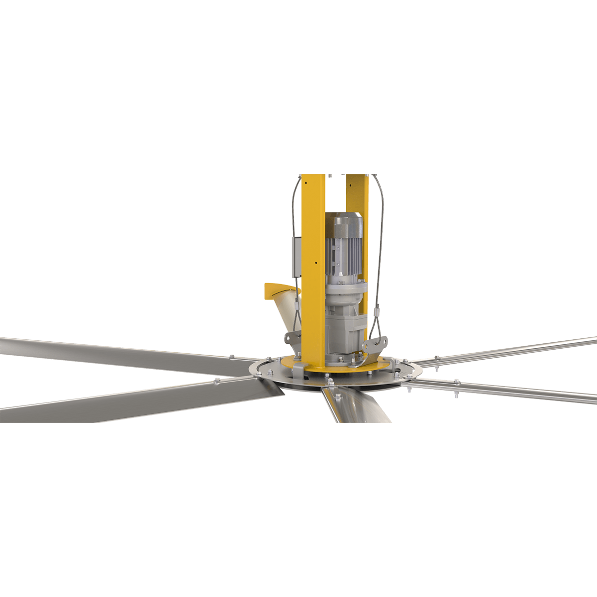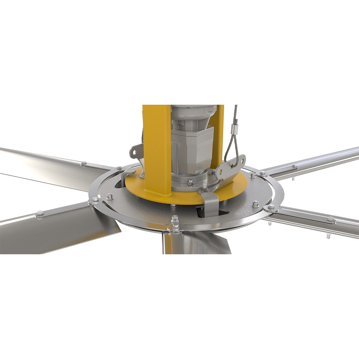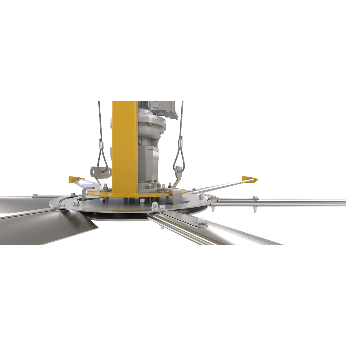The SHOPFAN 14-foot HVLS fan’s standard upper mount installs to I-beams and bar joists. These features ensure safe operation for occupied industrial spaces.