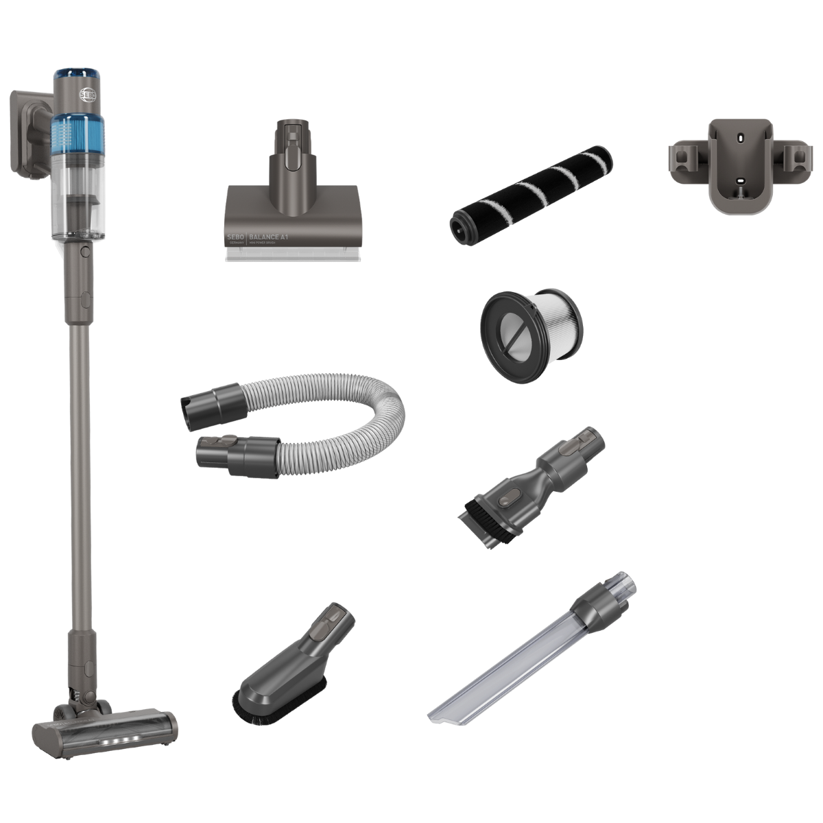 The upgraded SEBO Base Station keeps your SEBO Balance A1 organized, charged, and easy to access, whether mounted on the wall or used as a unique free-standing station that doesn’t require permanent installation like most stick vacuums. It stores all key accessories, including the Dust and Upholstery Nozzle for surfaces and gaps, the Mini-Power-Brush for pet hair, and the MultiCare tools for floors and stairs. The flexible extension hose stretches up to 59 inches, making corners and car interiors easy to reach. Everything stays tidy, accessible, and ready for the next clean.